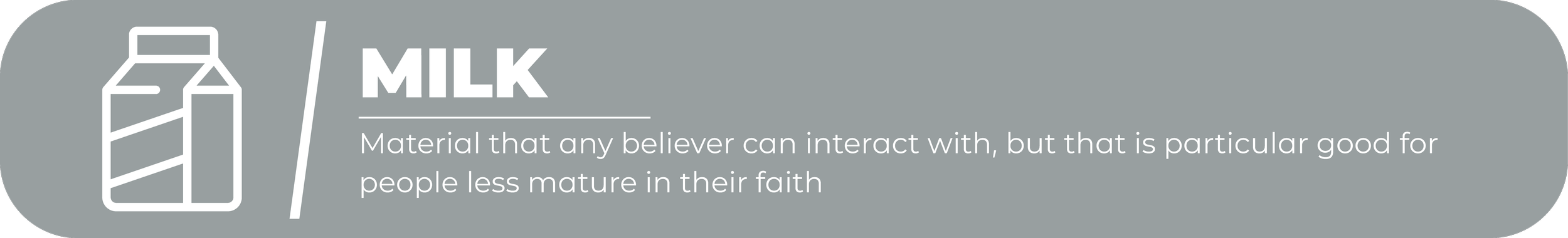 - Milk: Material that any believer can interact with, but that is particular good for people less mature in their faith