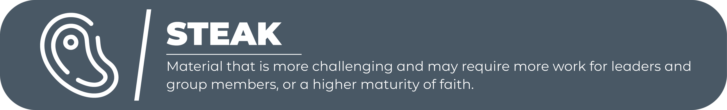 - Steak: Material that is more challenging and may require more work or maturity of faith. These also include studies that require more of you as a leader (such as leading a traditional Bible study), and some might include “homework” for your group to complete outside of group time.